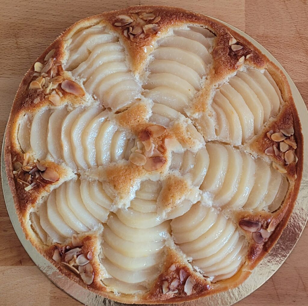 Pâte sucrée, crème d’amandes, poires au sirop, amandes effilées