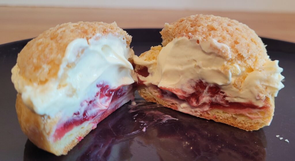 Pâte à choux, craquelin, coulis framboise, ganache montée passion