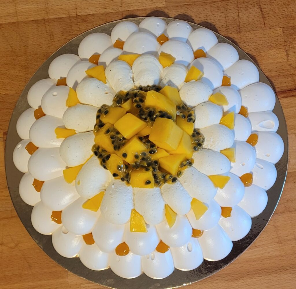 Meringue française, coulis mangue passion, crème montée, fruits frais