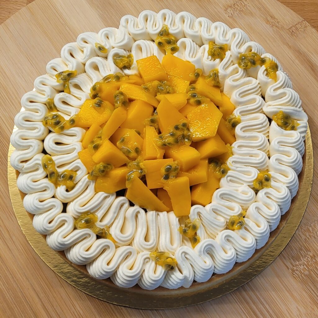 Pâte sucrée, crème d’amandes, coulis mangue, ganache montée passion, fruits frais