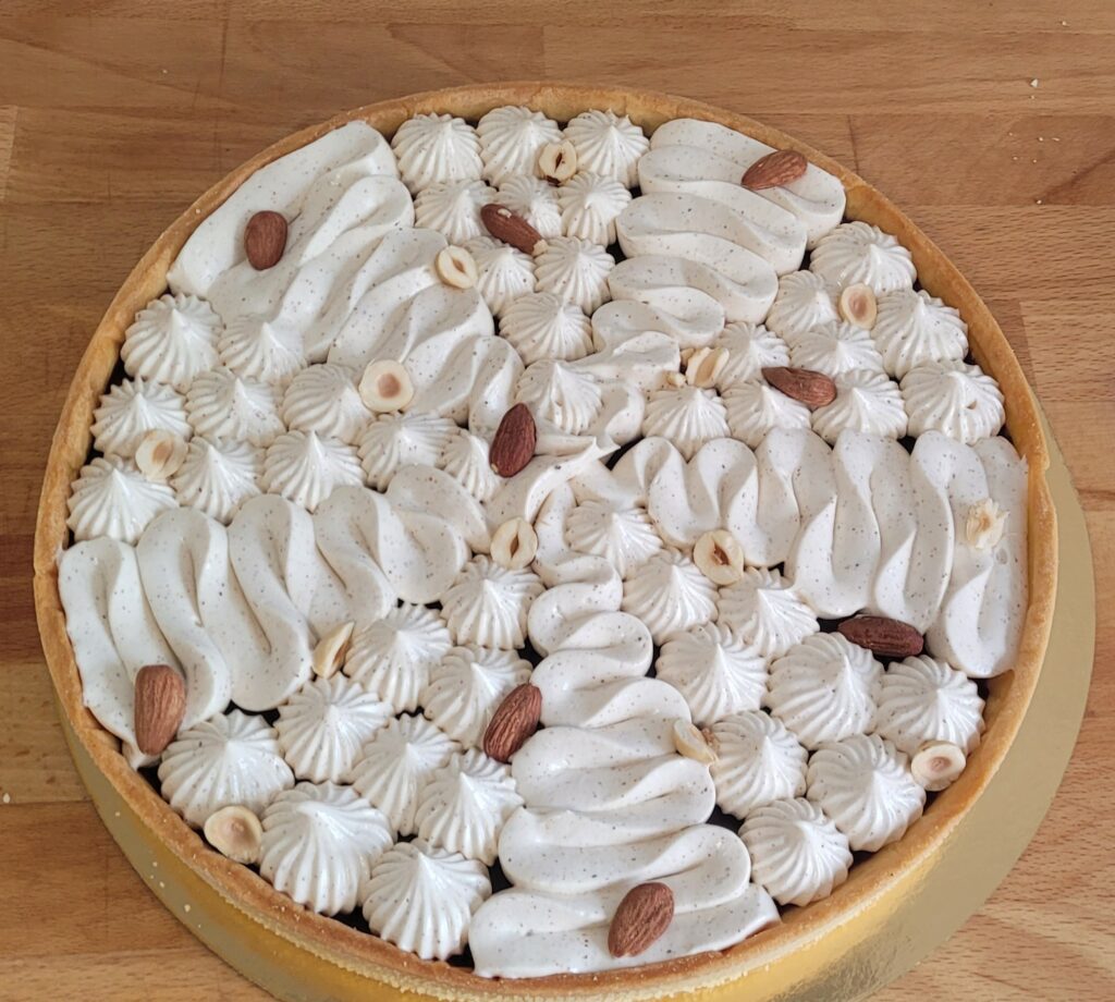 Pâte sucrée, praliné, crémeux vanille, biscuit amande, ganache montée praliné